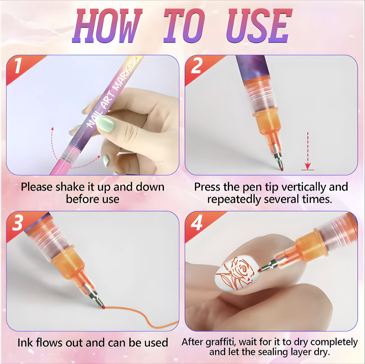 Shake the pen up and down before use to mix the ink. Press the tip vertically on a surface several times until the ink starts flowing. Once the color comes out smoothly, draw your design directly onto the nail. After finishing, let the ink dry completely and apply a top coat to seal your design.